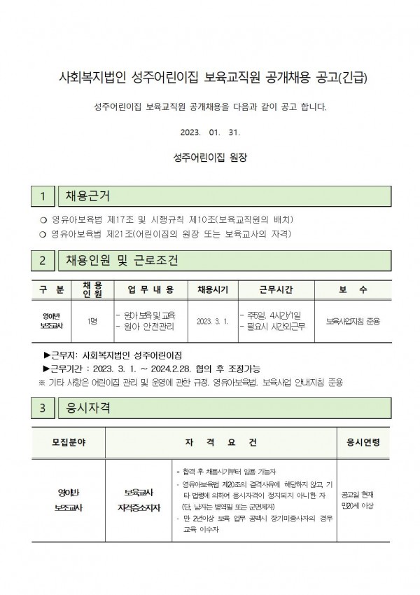 사회복지법인 성주어린이집 보육교직원 공개채용공고(긴...